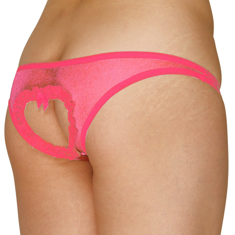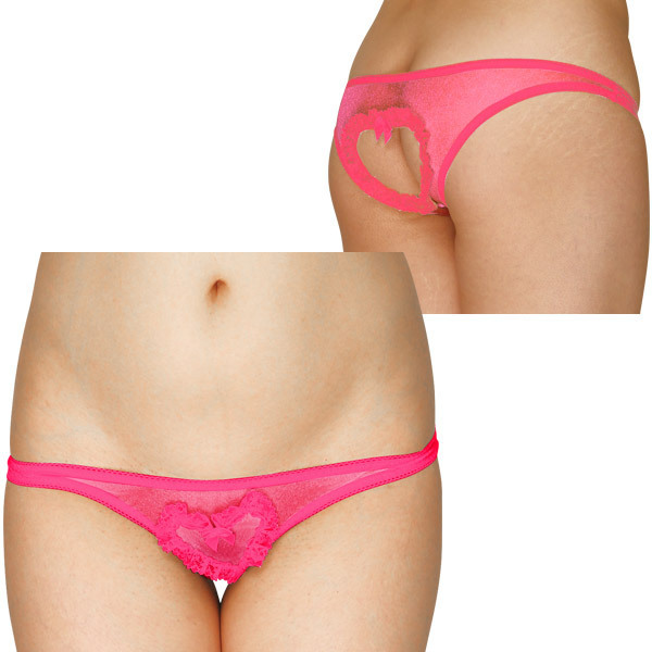 ●ビビッドで可愛いローズカラー●両面ともシースルー生地仕上げ●穿きこみ浅めなローライズ仕様●フロントにハート型ポケット●バックはハート型にオープン●愛らしいフリル&リボン付き。