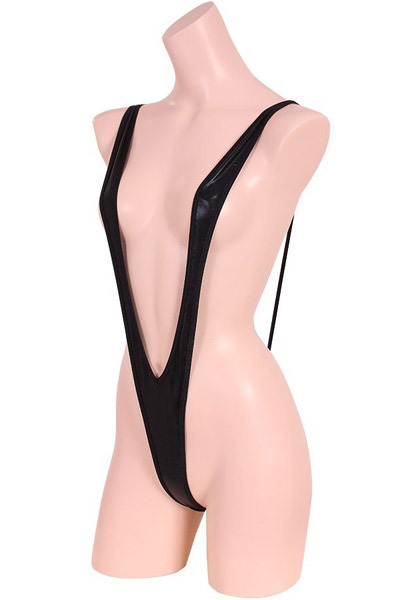見えそうで見えないギリギリ感がたまらない!超セクシーなメタリック素材のサスペンダーショーツ「V型メタリックプレイスーツ ブラック」。
