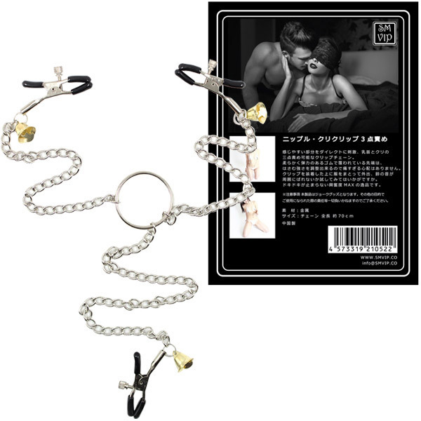 こちらは両乳首とクリの3点を同時にクリップで挟み込んで刺激を与えるグッズで、SMチックなイタ気持ちよさでM心を高めてくれるでしょう♪チェーン長は70cmあるので女性の身体ならば両乳首とクリの3点責めにジャストなサイズと言えるでしょう!それぞれ先端にはワニ口のクリップが付いており、ゴム製のカバーで覆われているため跡が残りづらく、挟む強弱も調整出来ます。