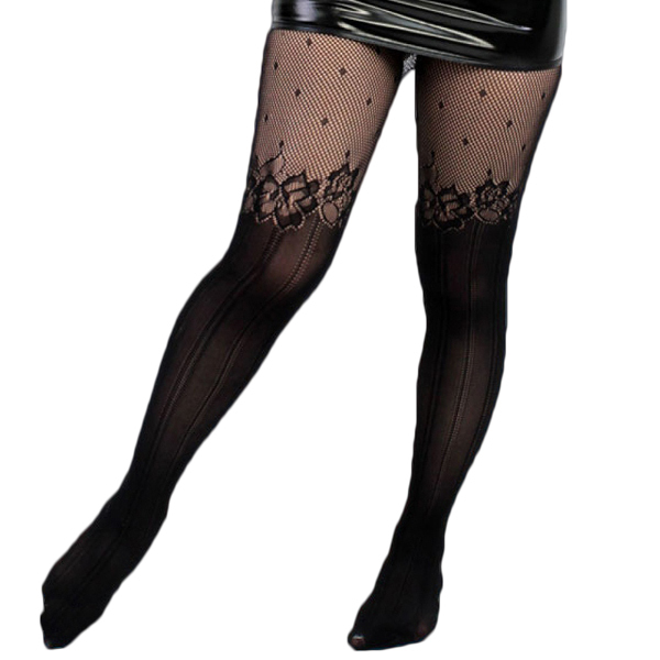ニーハイ風のデザインがお洒落♪季節問わず使える柄ストッキング黒(ドット×花柄)。