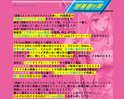 「淫紋のウテルス」シリーズ第2弾が登場!3方向から繰り出される程よい締め付け感♪奥へ進むほど狭まる2段締め構造に加えて、吸盤のような丸ヒダや突起ヒダで刺激する!本品は柔らか弾力素材のソフトタイプ