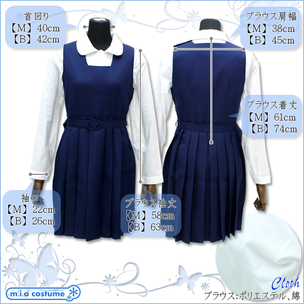 セット内容:ジャケット(襟取り外し可・肩パッド入り)、丸襟ブラウス(前開き・ボタン留め)、ジャンパースカート(バストからウエスト部分に肩ボタンとサイドボタンで着脱可・ベルト取り外し可)、ベルト