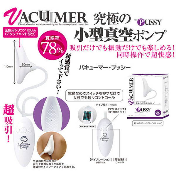 ●アタッチメント部は医療用のシリコン素材を採用●滑らかな曲線を描いた形状で女性のアソコをぴったり覆うことが可能●アタッチメントの内側にはツブ状の突起がびっしり●真空率78%のハイパワー吸引●初心者でもすぐ扱えるボタンスイッチ●リモコン左ボタンは2段階のバイブレーション切替え●中ボタンは吸引解除スイッチ●右ボタンは電動吸引のON/OFF●別売りの専用アタッチメントに付け替え可能。
