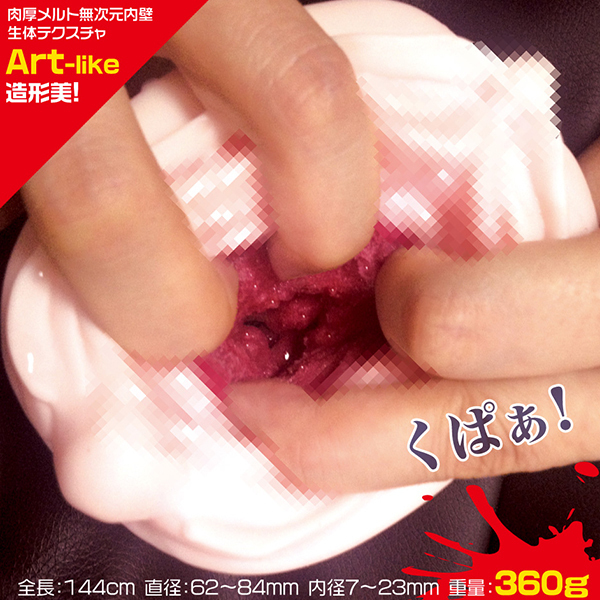 肌色の側面にもビラビラを刻み込み、ちょっとしたグロさをアピール!膣括約筋・Gスポット・ポルチオにある、3つのパワーリングの弾力で、まるで三段俵締めの名器のような吸い付き&締め付けを味わえる、非貫通型・無次元オナホールです。