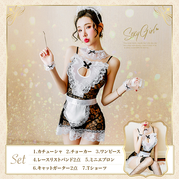 | サイズ/ 仕 様 | フリーサイズ セット内容:カチューシャ、チョーカー、ワンピース、レースリストバンド×2、ミニエプロン、キャットガーター、Tバックショーツ | ||